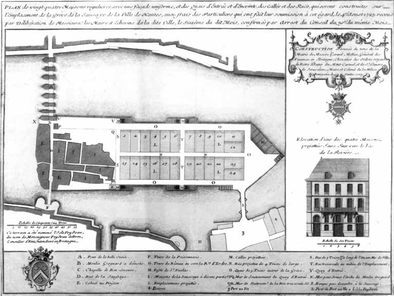 document ne permet d'affirmer son état de propriétaire. Plus de 200 ans après certains immeubles sont encore occupés par des descendants directs des premiers acheteurs ! -Parcelle 14, au 7 quai Dugay-Trouin, au recensement de 1814 le propriétaire est un Pichelin. -Parcelle 24, 1 place de la Petite Holande, le 17 janvier 1785 François Claude Charon vend 1/3 de la maison, rez-de-chaussée et entresol à un très riche négociant nantais Mathurin Barthélémy Trottier. Charon avait tout de même gardé le terrain 60 ans et fait construire, on ne peut pas parler de spéculation dans ce cas. Le pont prévu par Goubert devait donner beaucoup